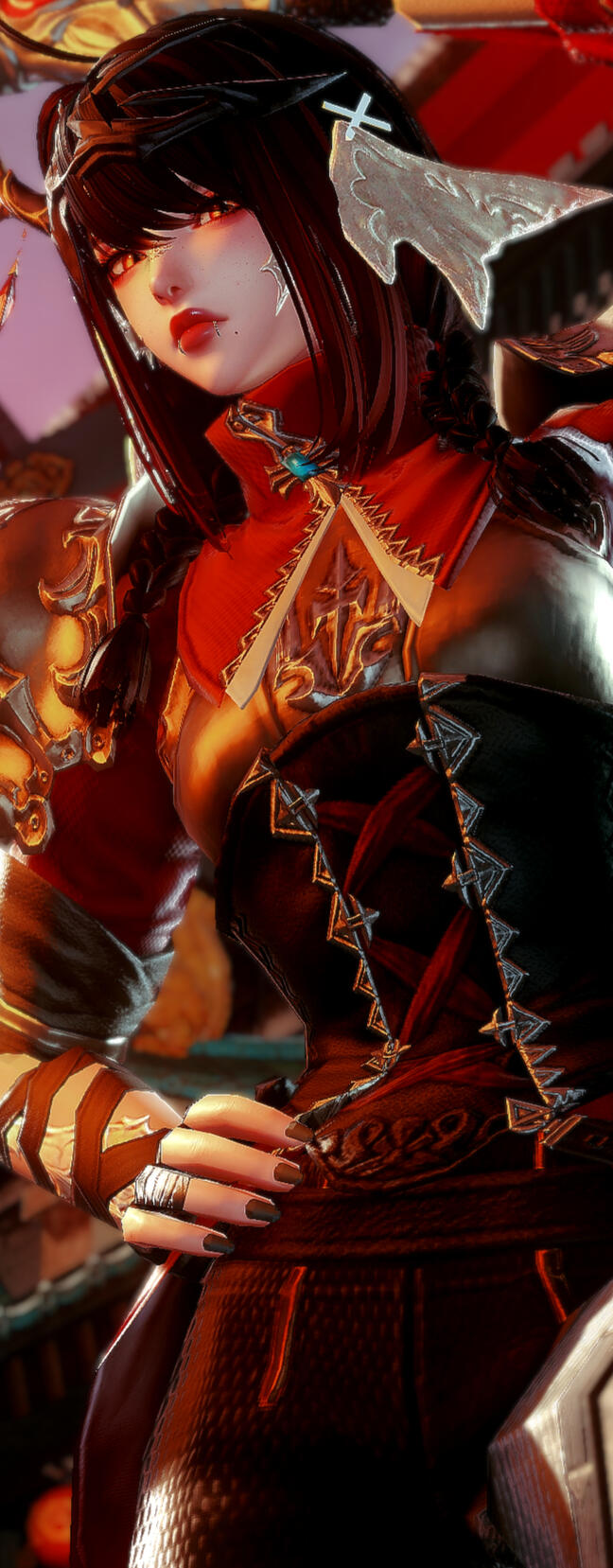 | notable features | Red limbal rings. Different eyecolors (heterochromia). She got scales growing on her nose. Darker "gothic" makeup when applied. She's partly infused by niddhog's blood and aether, her rage being her strength. Her ink on her body are expressions of rebellion against her father's wishes. Hearts under her eyes / on her cheeks but never on her sleeve. |