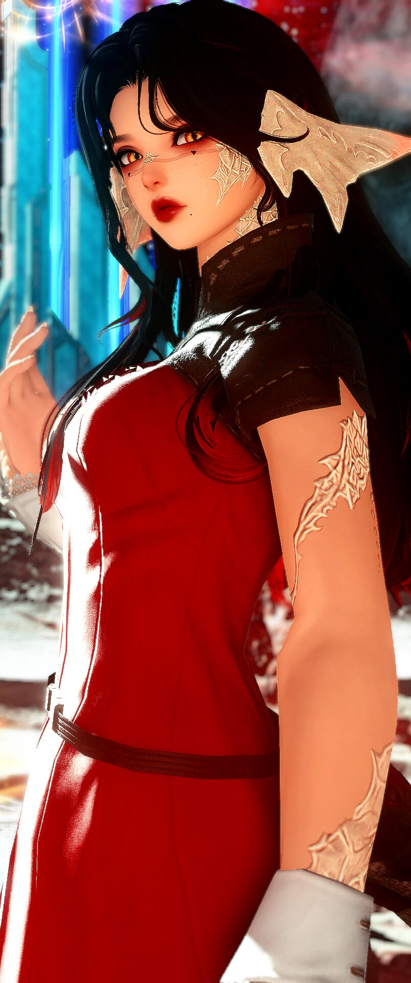 Born under the cold seas and on the warm sand of sui-no-sato, the raen was first born as the older sister and twin of a younger brother. Her name was Tomie, meaning plentiful river. as an au ra of the isolated sea village, she was born with the ability to breathe underwater and therefore also has enhanced swimming abilities.both parents merchants wanted to move the family out from the dull and isolated lifestyle of the ruby sea, so they moved to ul'dah. from there, life would seem to only go up from there- that is until the twins' parents up and left. the two would be thrown into foster care... though that would turn out to be the worst decision- the foster parents would rather feed them scraps and make them do all the chores, essentially working the two to death and almost leaving them to starve or on the brink of starvation. this could explain homura's general shortness later on in life. but the scars left behind from an unloving home could never heal and homura has grown quite spiteful, angry and scared for her little brother. she would often grow violent and attack those who even dared to look at them.anyone who dared to look at them with a look would have a young angry au ra attack them, have their gil stolen as she was quite small and slippery or even have her steal one's food and necessities. it wouldn't be until the twins would reach their 8th birthday when a kind viera would calm the two scared and frustrated raens, taking them home and caring for them until they were older. he would name the sister 'homura' respectively and the brother 'taki'the meanings being quite literal, for homura was a little blaze and taki was a gentle waterfall. homura would forget her real name and adapt the name homura fully. At least she says she forgot who she used to be and she was happy to just be with a father and her brother who she cared for greatly.she would pick up many different jobs to provide for her brother, many of which were extracting information... or worse: be a maiden of the night. she would do things she hated. she never wanted to do but had to just to keep taki happy. just to make sure he never suffers again. just so that he never goes to sleep with an empty stomach. all she has to do is keep it a secret... he can't know what his sister does to keep him happy. she doesn't want him to know.things come at a cost when you do it for a beloved and never learn to love yourself. and hopefully no one will ever find out what she does in her spare time.